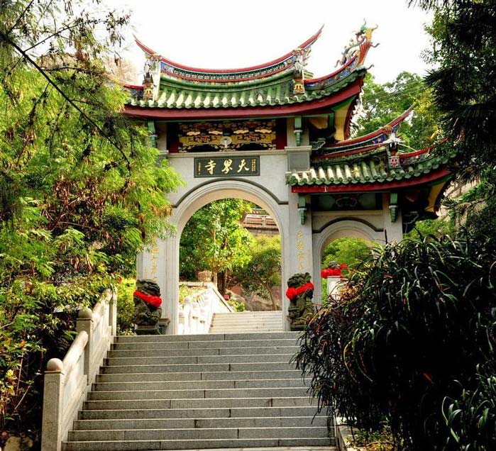 天界寺,原称醉仙岩,祀九仙;又名醴泉岩,俗称仙洞,在厦门万石植物公园南侧。据传,从远处眺望天界山势,恍若仙人醉酒偃卧山上,故称“醉仙岩”。