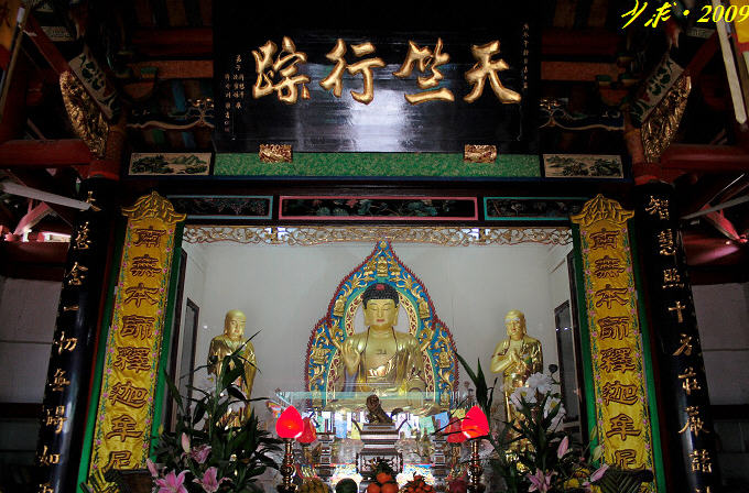 大殿上方,有明天启间本县进士沈起津书的“天竺行踪”横匾。大殿正中奉祀释伽牟尼佛、阿弥陀佛和药师佛。两侧是文殊菩萨和普贤菩萨,韦驮尊天、坚牢尊地站立两旁。两侧十八罗汉神情各异,形象栩栩如生。大殿香案正中立有一座明末“敬颂万历皇恩”的龙牌和一座宋时铸造的古香炉。
