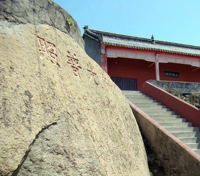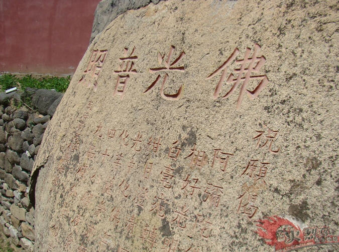 淄川竹林寺 位于淄川太河,可能以其中殿即观音殿前两簇茂盛的竹丛而得名。大雄宝殿前、观音殿的西侧有一块巨大的花岗石,上面镌刻着一部题为“佛光普照”的祝愿偈,在正午的阳光下,巨石似乎发出闪闪的金光,本想用手中的DC演绎一下,可水平有限,只能纪实“照相”,请各位欣赏。