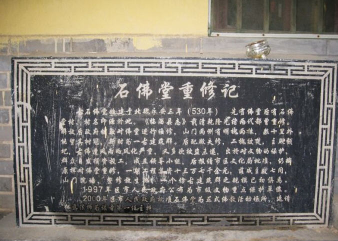 石佛堂村落形成历史久远,初名“桃花村”,因四周多植桃树故名。至北魏,鲜卑贵族崇信佛教,大兴佛寺,广造佛像,在此建寺,寺内佛龛背有“大魏永安三年”(530年)字,后人遂以“石佛堂”取代了桃花村,村名流传至今。