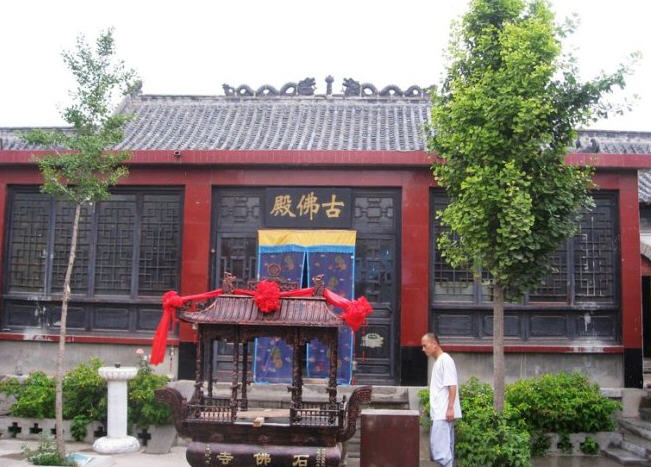 古佛寺经年久远,其间几度兴废,约宋元时期又建,山门东西各植国槐一株。清康熙、乾隆两代又重建,寺院颇具规模。有正殿三间,东配殿为药师佛殿两间,殿东南首有关帝庙,坐北面南。西配殿两间,为护寺者居所。殿西南首有石启建石佛堂寺功德碑文重修石佛堂寺石刻弥勒佛相碑文碑两通,正南山门照壁,院墙围立。门外大路东西古槐各一株,东边一株高约12.5米,树腹裂破,树势较弱。西边一株挺拔耸立,树高近20米,树围5米,冠径达14.5米,枝繁叶茂,两树树龄均600年之久。为防止古树破腹,村民崔学周雇请铁匠打造铁箍两道,将树干围牢。惜“文革”时期古树被毁。