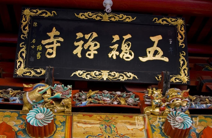 五福禅寺是石码地区第一大古寺,位于石码镇解西仙庵路。系砖木结构单檐悬山顶的古建筑,坐南面北,二进三开门。远远望去,红瓦为顶、青石为基,高翘的燕尾脊屋顶盘龙戏珠、八仙齐聚,屋檐下雕梁画栋、梁柱涂金,所有雕饰更是品种繁多、金碧辉煌。敞开的寺门楣顶则悬挂着一块黑底花边金字牌匾,上书“五福禅寺”四字。前殿进深三间,依次为前殿、天井、后殿、后天井,全长46.6米,宽16米。还有左右二侧配殿和厢房。范围宽广,占地面积1300多平方米,建筑面积近1322.7平方米。现主寺为两进,走进禅寺,和众多寺院相同,迎面而来的便是“大肚能容天下事,笑容可掬欢喜缘。”的弥勒佛。弥勒佛右手边有一书架,架上摆满佛学典籍和劝善读物,其背供奉三官大帝,左右附彭祖、甘罗,两侧祀清水祖师、地藏王菩萨。大殿正中供奉华严三圣,其前两旁祀站立的韦陀、护法;两侧祀观音大士、伽蓝菩萨,还有那十八罗汉,有的咬牙切齿,怒目而视;有的朱唇微启,面带微笑;有的盘膝而坐,双手合十;有的眼睛微闭,手持经典;有的手压龙虎,拳舞掌劈,高矮胖瘦各不相同,神情动作千姿百态。