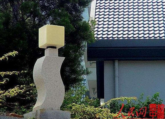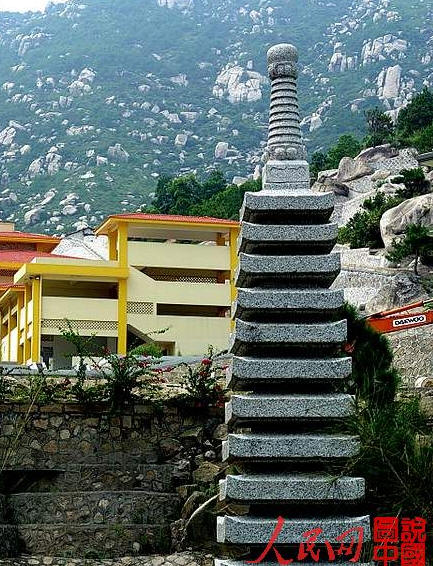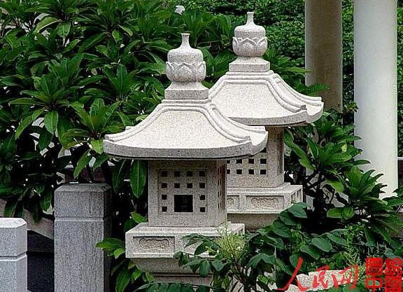 普照禅寺寺前的广场,有一个半圆形花台,花台中有一座五层石塔,石塔前有两只石雕梅花鹿,一立一卧,栩栩如生。