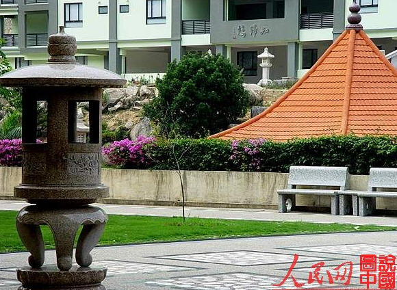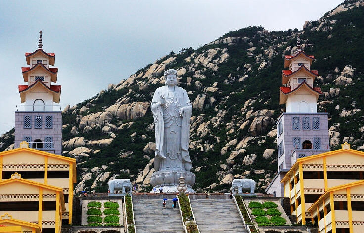 沿平台后石阶而上,则来到第二平台。迎面则是普照禅寺大门,大门上,“普照禅寺”四个字金光闪闪,两旁的楹联是“剏造禅林庄严梵宇导民向善,慈悲喜舍佛漉净业宗趣广达。”是“沙门竺摩”的题字。平台两旁也各建成长廊,可沿石阶到达第三平台。