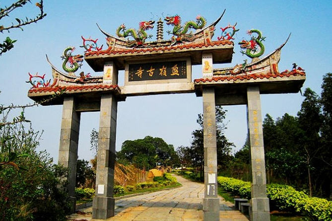 关隘,块石迭砌,长8.6米,高3.56米,拱门宽2.38米,高2.44米,门上嵌“同民安”石匾,关隘门后(靠南安侧)另立一石碑,碑文刻“小盈岭南—同交界碑”几个字。几棵树龄在800年以上的古榕树依然苍劲地生长在关隘另一侧,这些榕树正是朱熹当年为防风沙发动百姓所栽。4年后,当朱熹要离开同安时,百姓送他到小盈岭,“扳辕不忍离”,朱熹为此在一块巨石上题字“扳辕石”,以感谢同安百姓的厚意。关隘后(靠南安侧)有宫庙,我去时,一座新建的“大雄宝殿”又揭地而起,金碧辉煌,里面正在忙着安装菩萨塑像。