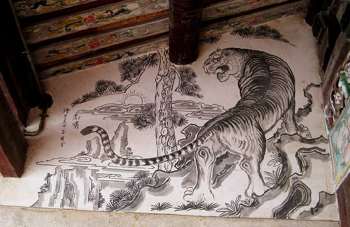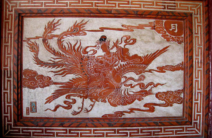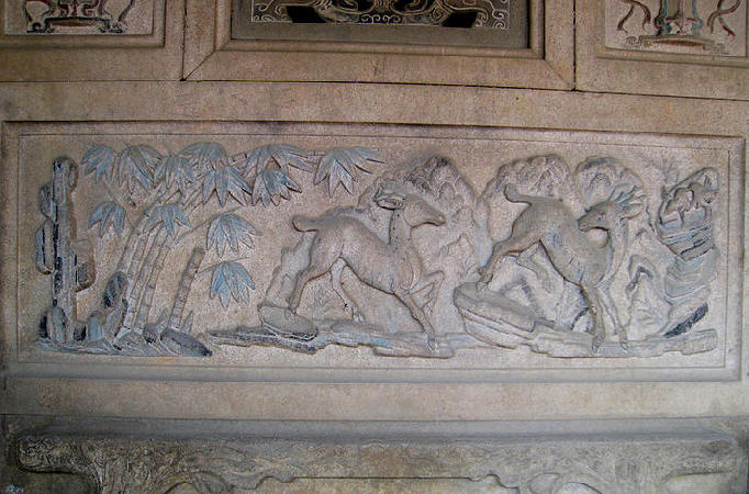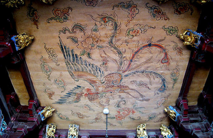 天井中有由上下双重须弥座构成的石砌月台,上刻“飞天乐伎”、“双狮戏球”等浮雕纹饰。台上蹲踞状石狮一只,因是皇母后祭赠,称“国母狮”,狮的右前肢举握一方印,印上阳刻寇服饰的服款(“十二章”纹饰的衮服款式之最后一种)“亚”字纹饰符号,均为宋代雕刻。月台前有一水井,称“龙泉井”。宫外左右两侧各有宋代水井一口。