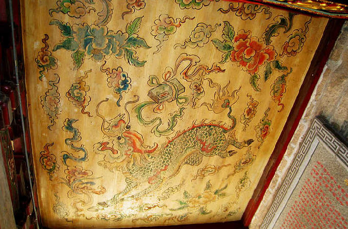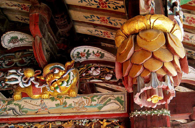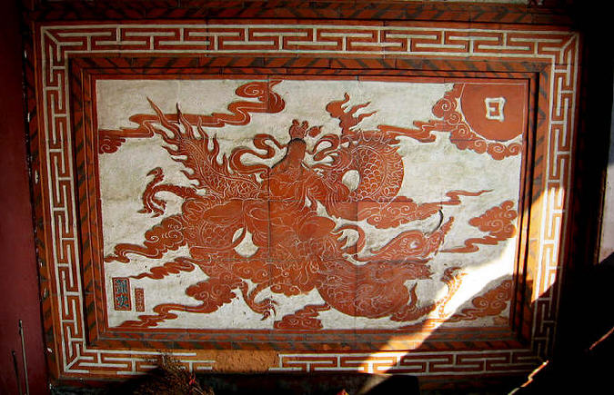 正殿台基高于前殿台基2米,单层宫殿式,重檐歇山顶,,面阔五间、进深三间。正中间殿顶木架结构为如意藻井,斗拱出五跳。次间用梁抬梁式,斗拱均不出跳,有昂傲象鼻状。走廊竖有4根褐色花岗岩蟠龙石柱。