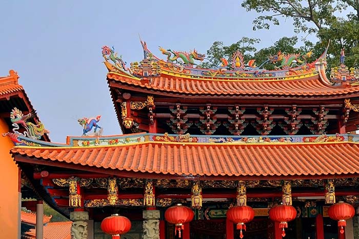 大雄宝殿之后为大悲殿,平面正八角形,三重檐,顶层正面双向坡顶,主脊堆剪飞龙宝塔,余六面变体攒尖,飞檐翘角。