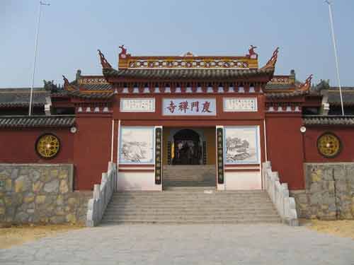 度门寺位于玉泉寺之东七里许楞伽峰岗,座西向东,俯望长坂,背依堆蓝,两侧山峰袖折,似屏障环列。唐神秀国师开法栖息归葬之地也。昔鼻祖东来,一花五叶,黄梅付法,始分南北。南宗能者曰大鉴,主顿悟说;北宗秀师谥大通,普接群机,借教悟宗,时人曰渐教。若究至理,则无为性宗,离即绝非,果入不二,顿渐亡措。若论差别智,所谓:圆人说法无法不圆,一切贤圣皆以无为法而有差别也。了此则顿渐皆权机也,同归圆实也,无是无非也。享两京之法主,三帝之国师,屈万乘而稽首,未虚云也。