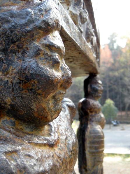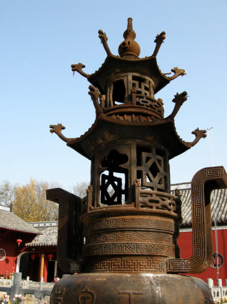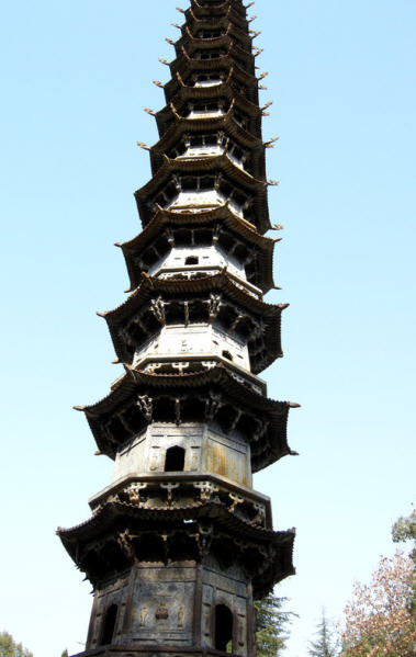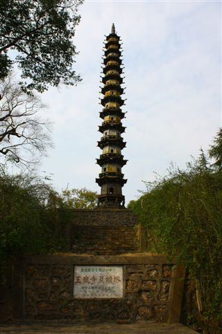 玉泉寺前三园门北侧青龙山馀脉冈地上有玉泉铁塔一座。铁塔本名“佛牙舍利塔”,俗称“棱金铁塔”、“千佛塔”,北宋嘉佑六年(1061年)为重瘗唐高宗、则天皇后所授舍利而铸建,仿木构楼阁式,八角十三级,通高16.945米,重26472公斤。铁塔由地宫、塔基、塔身、塔刹四部分组成。地宫为石质六角形竖井,内置汉白玉须弥座,座上置石函三重,函中供奉舍利;塔基、塔身均为生铁铸造,塔基须弥座八面铸有铁围山、大海、八仙过海、二龙戏珠及石榴花饰纹,座八隅各铸顶塔力士一尊,全身甲胄,脚踏仟山,状极威猛;塔身平座上铸有单钩阑,塔身各作四门,两两相对,隔层交错;塔身及平座铸有斗拱;腰檐出檐深远,翼角挑出龙头以悬风铎;塔身上著有铭文1397字,记载了塔名、塔重、铸建年代、工匠和功德主姓名及有关史迹,还铸有佛像2279尊,俨然一副铁铸佛国世界图;塔刹为铜质,形似为宝葫芦。铁塔通体不施榫扣,不加焊粘,逐件叠压,自重以固;其外型俊秀挺拔,稳健玲珑,如玉笋嵌空。玉泉铁塔是我国现存最高、最重、最完整的一座铁塔,它对研究中国古代冶金铸造、金属防腐、营造法式、建筑力学、铸雕艺术以及佛教史具有十分重要的价值。
