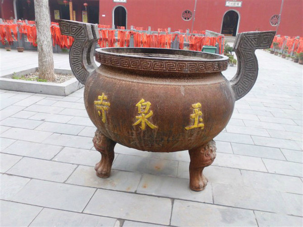 玉泉寺属全国重点文物保护单位,这里文物集聚,珍贵罕见。寺前的铁塔,始建于北宋嘉祐六年(公元1061年),由玉泉寺僧务本禅师领工铸建,它是我国目前最高(七丈十三层)、最重(十万六千六百斤)和保存最完整的铁塔。铁塔每层每边铸有“八仙过海”、“二龙戏珠”和海山、海藻、水波等文饰,线条清晰、流畅,台座八面,各铸托塔力士一尊,全身甲胄,脚踏仙山,头顶塔座,体态刚健,状极威猛;塔角飞檐,凌空龙头,悬挂风铎;逐层迭装,不加焊接,稳健玲珑;日照塔身,紫气金棱,交相辉映,故曰“棱金铁塔”。塔身还铸有2373尊小佛像,形态逼真,栩栩如生。寺内供奉有隋至明清历代大中型宗教文物36件,其中隋大业十一年(公元615年)铸造的铁镬,造形浑厚古朴,铭文清晰可见;唐代著名的宫廷画家吴道子所画的石刻观音像,男首女身,体态丰润,线条流畅;元代铸造的铁钟、铁釜,明清铸造的钟、鼎及万名化香炉,均有铭文记载其上。