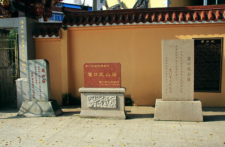 灌口凤山庙位于集美区灌口镇灌口街北侧,距集美镇只有7公里。凤山庙建于明末天启、崇祯年间(1621-1644年)。该庙原为两进宫殿式结构的建筑物,前殿有八幅青石窗雕、盘龙石柱、青石雄狮、石柱楹联及屋顶是翘角式明代石雕装饰,双龙抢珠的艺术雕塑,但因历史悠久,毁损甚多,后经历几次重修、扩修。现在前殿是由海峡两岸信徒集资修建,按清乾隆丙午年(公元1786年)式样修葺一新。楹联都是前清时期同安县的举人、大学士所写,工笔完整、书法技艺精湛。后殿是民国十八年(1929年)由仰光同安县安仁里公会捐建的钢筋混凝土建筑。
