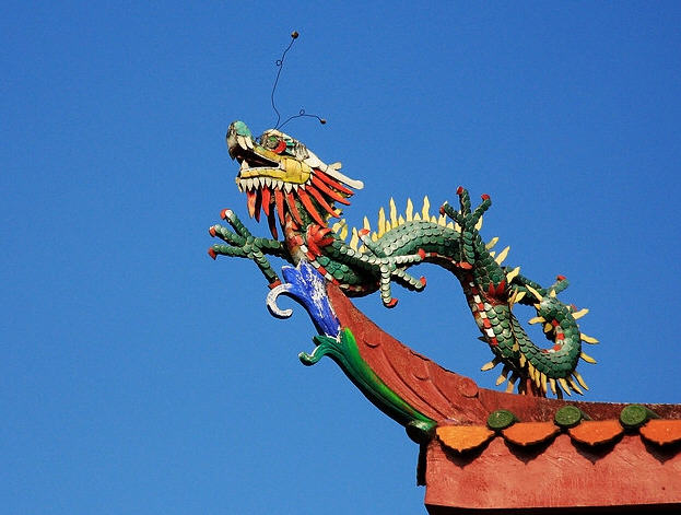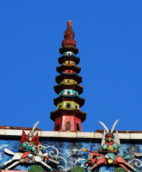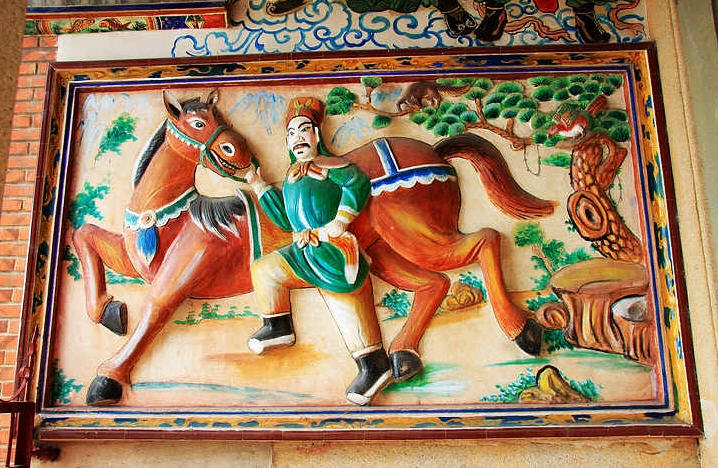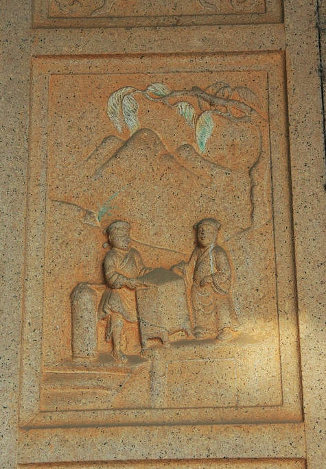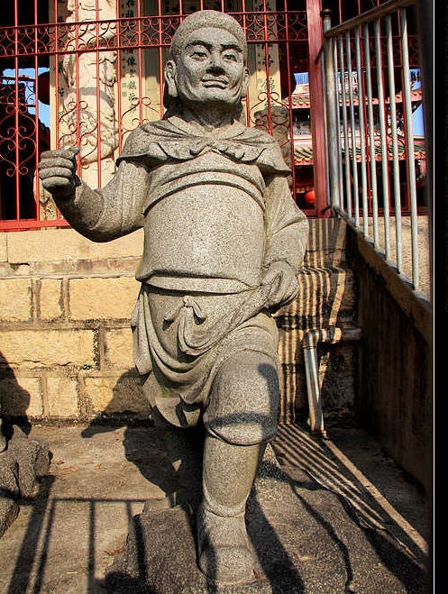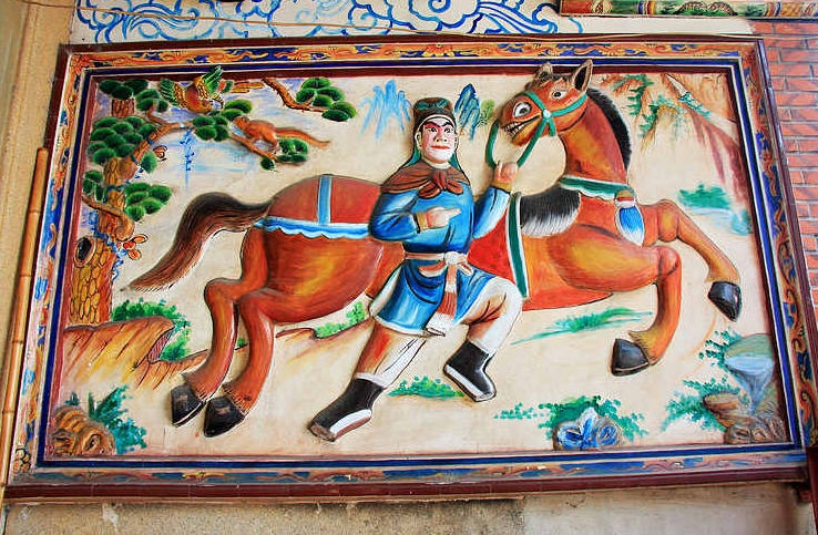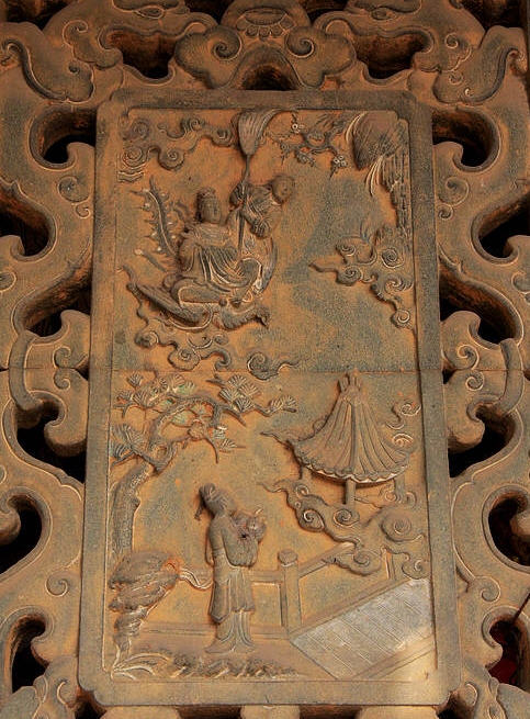 凤山庙是祀奉"李府清源真君二郎神",李冰及其次子因治水有功为后代庶民所敬仰,二郎神因为民除害除掉蜀郡都江之孽蛟,后人遂在四川灌县立庙纪念,宋真宗时追封为清源妙道真君。现今灌口镇凤山祖庙的前殿记载着该神的来历。青石窗雕描绘蛟龙兴风作浪,一老一少与孽蛟搏斗;后蛟龙屈服,江上风平浪静,祥云朵朵,一老一少驾着被驯服的蛟龙,迎着彩云,冉冉上天。