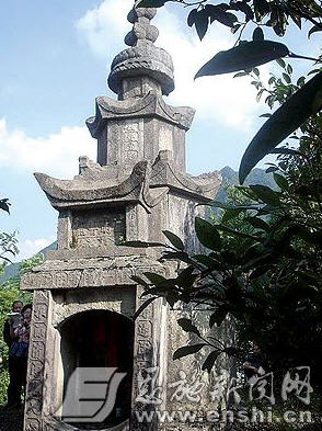 茔塔:立于寺庙右下方约30米的山腰绝壁边,塔高4层约6米,六角形。建于道光三年,塔门横眉上横书“极乐世界”四字,塔门两边佛联为: