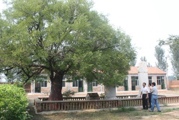 无历史记载的古槐树位于现学校后面硬路的东侧,高5--6米,树身只剩北侧一硬皮(厚10--15厘米),硬皮呈弧状(弧长1米有余),根据现树身的形状,可推测树身直径可达1.5米以上,周长约5米。就是这柄苍老的树皮支撑起巨大的树冠(直径约6米)。据于洪祥老人讲,建国初,学校做为信号的大钟,有3800斤(1958年大炼钢铁时毁坏),就挂在古槐向东南方伸出的一枝上,同样由老树皮支撑,不能不让人佩服大自然的造化及其神奇力量。