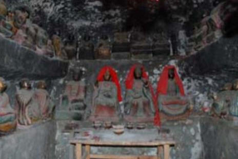 近日,商城县文物普查队员在距县城19.5公里的伏山乡石洞村彭老塆居民组西头,新发现石窟寺一座。该石窟高约8米,宽约4米的似“象鼻”形的巨石内的自然洞窟,洞深2.6米,高2.60米,宽2.30米,东、西、北三面洞壁雕两层供台,其上安放观音,罗汉雕像。三面洞壁绘人物彩绘组画,依稀可见,洞门高约2米,宽约0.95米,均用条石垒砌成高约1.70米的十级石阶且两边立有四根石栏杆,石级前是用岩石凿的六边体的香炉台,台上放置一石缸形的香炉,缸面的字体模糊已不可辨认。现尚存佛像十七尊,属明代遗物。保存尚好。整个洞窟坐北朝南,北靠山腰,南邻小河、公路、求雨台山相接,东、西和现代民宅相望。石窟寺现状保存较好,基本保持了原洞窟的布局形式和寺内建筑规模,洞内由于常年的香蜡烟熏,三面洞壁彩绘人物组画,已模糊不清晰。