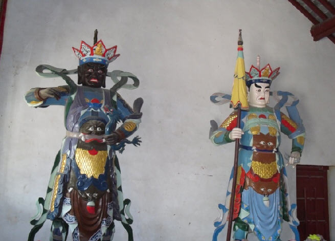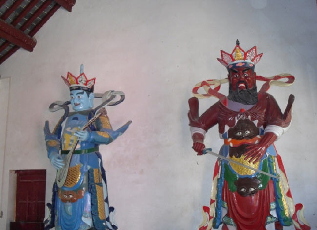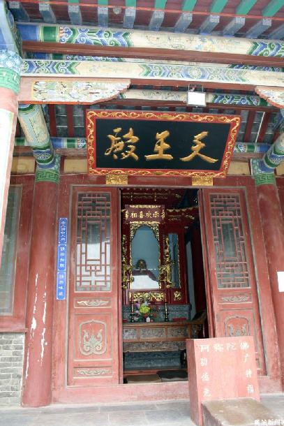 天王殿 ( 前殿 ) 供奉“当来下生弥勒尊佛、护法韦驮菩萨及四大天王 ( 东方持国天王,西方广目天王,南方增长天王,北方多闻天王 ) 造像”凛凛威风的护法造像,使善人安、恶人寒。慈颜大度的菩萨,广接有缘众生,普生欢喜。一折一摄,充分展现了佛法的包容与威严,也使人感受到了学佛的尊贵与庄严。