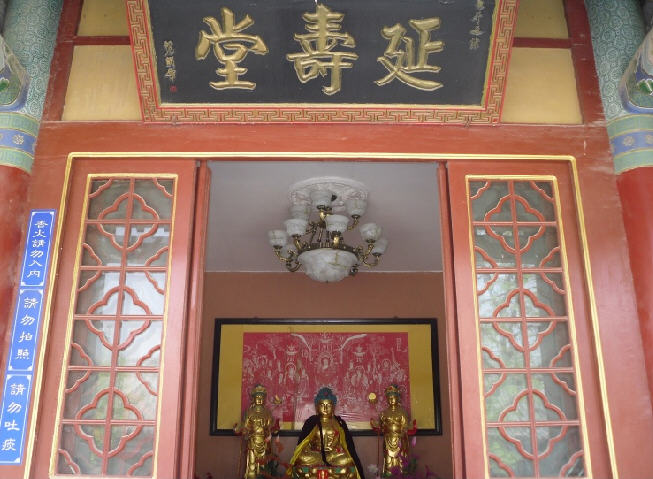 “大雄宝殿”四个金匾大字,是由已故中国佛教协会会长赵仆初大德亲笔题写的。 大殿中供奉三世如来,分别是“娑婆教主-释迦牟尼佛;东方琉璃世界一消灾延寿药师佛、西方极乐世界--叫阿弥陀佛”。两旁分别供奉大智文殊师利菩萨、大行普贤菩萨。东西两壁悬挂十八罗汉壁画。此供奉形式,是模仿当年释迦如来灵山一会场景的布置的,使人一进大殿,便如同亲临盛会,以同沐我佛慈霖灌顶之加持。更悬以幢幡,张挂宝盖,如天人聚会,异彩庄严,千佛灯矗立西东,琉璃灯伞撑挂高空,恰似日月照临,更同佛光普照。卑使见者闻者,生恭敬心,同增福慧。