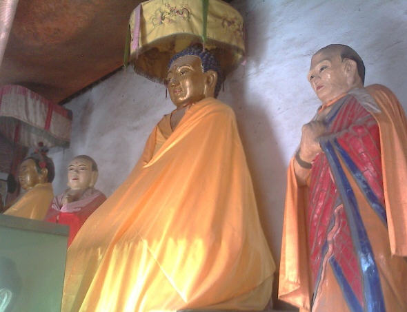 最下方的天王殿内供大肚弥勒佛像,两侧塑有身材硕大的四大天王像,手中的法器,寓意为风调雨顺,弥勒佛背后供有韦驮菩萨像。