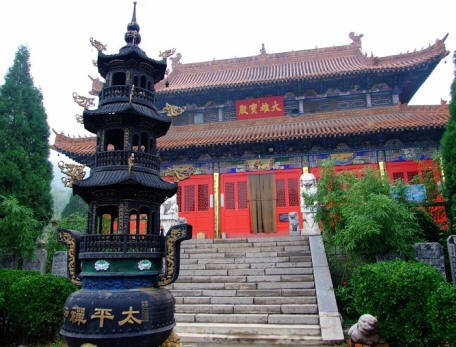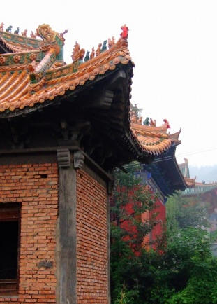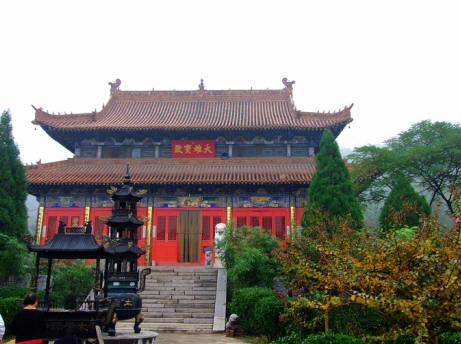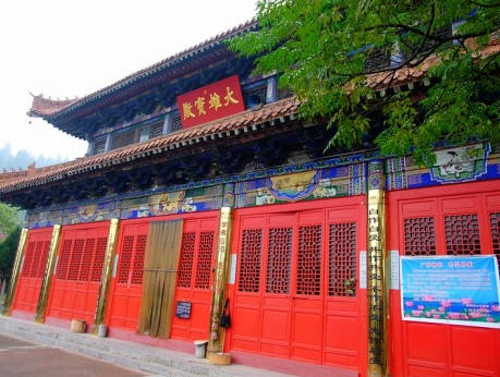 寺庙依山势向上四重建筑依次为山门、天王殿、观音殿、大雄宝殿,大雄宝殿两边则是禅房,肃穆的佛乐不断从禅房中飘出来,丝丝入耳,杂念顿去。