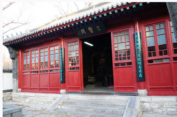 三圣殿是最后一层主殿里面供奉的是阿弥陀佛、观世音和大势至菩萨。殿两边为二十诸天护法神的壁画。