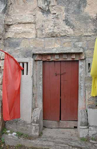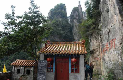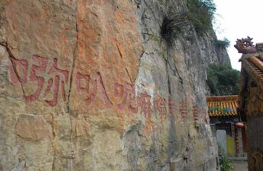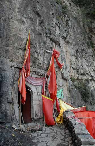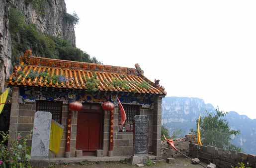 小西天的寺庙有三四处,分散在断崖或石壁上,非常险要。既有佛教的佛殿、观音殿,也有道家的碧霞殿、西天老母石殿,其中西天老母殿是在绝壁的石灰岩上开凿而成,有一间房子大小,真正是石顶、石地、石壁、石门、石窗、石供桌,在山下看到的几杆红旗就斜插在这里。