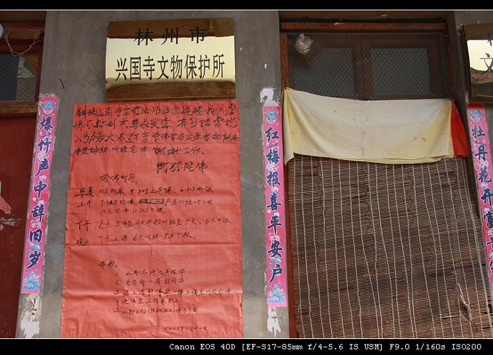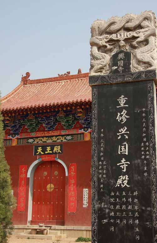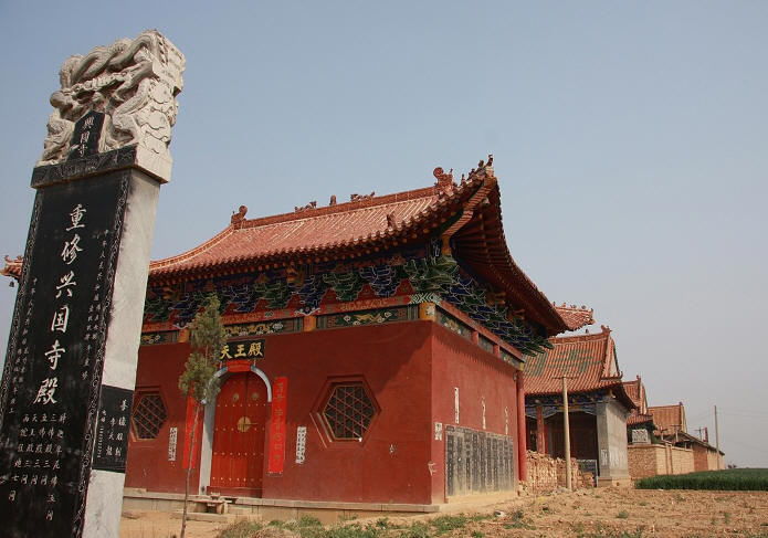 兴国寺在1944年完全拆毁,现今的兴国寺是近年重建,在没了当年千年古寺的味道,庆幸的是那几块石碑给了这座新建筑很大的面子。想回想他当年的繁盛,还需旁证。鹤壁市山城区鹿楼乡故县村有座千年古刹——胜业寺。寺中碑文记载,当年该寺初见,地多僧少,而附近林县(今林州)东姚镇的兴国寺却是僧多粥少,于是,胜业寺便一次从兴国寺引进了30名和尚,胜业寺由此逐渐兴盛。哈,没想到当年林州还搞和尚输出,也可以想象兴国寺当年绝对不只是30名和尚,我猜60是保守的吧?一个寺庙不可能把一半的和尚给一次“批发”出去。近百名的和尚同时诵经,那是何等的宏大?近百名的和尚吃喝用住,那当年的兴国寺该是何能繁盛?