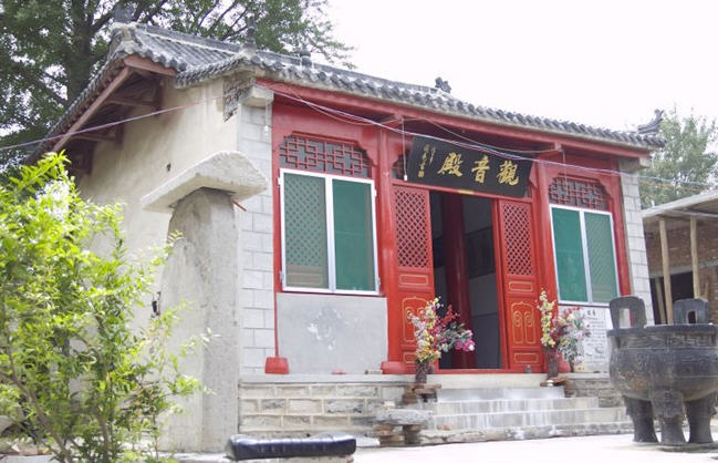 阁子的北面前行百余米有一座荒凉的独门小院,进入新修的砖砌大门后,迎面是两块嵌在一座房子南墙内的石碑,从碑文可看出这是“黑龙峪观音堂重修碑记”。右拐前行一座小巧的古建筑矗立在院子当中,这就是观音堂。整个建筑坐南朝北,高有4米多,长3米,宽2米有余。在观音堂的东墙旁有一株银杏树,树干直径约有60CM,高10余米,年岁应该很久了。绕过观音堂来到北面,堂前是另一座大门,原来这才是正门,只不过正门已经十分破败了,门里杂草丛生。堂前东侧还有一块康熙年间的重修碑记,保存较完整。