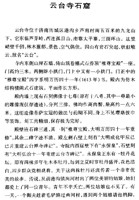 李攀龙和许邦才之所以选择到这个偏僻的云台寺游玩,与德王府大有关联。原来,明正统年间,有一个叫做道山的和尚云游四方,看到这里寺基废弃却景色幽深,遂决心在此重建古寺。道山近五十年的苦心经营,到成化年间,云台寺佛殿僧房才大致完工。道山又在寺东悬崖之间雕刻了石佛三尊、菩萨七尊以及伽蓝、土地等造像,使得整个寺庙变的“黄金丹砂璀璨、金碧辉煌映瞻”。基于此,道山的功名远播四方。
