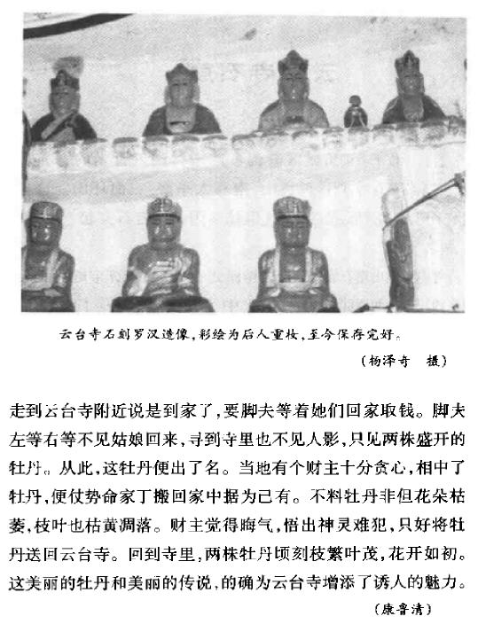 在云台寺周边的村子里,几百年来,一直流传着“云台牡丹不下山”的民间故事。故事的大意是,在云台山内大殿前,原有白花紫蕊的牡丹两棵,有几百年的花龄。很久以前,当地有个财主看好了这两株牡丹,硬是派人在晚上把它们挖出种到自己家中,想借此装点自己的门面。第二天,他便邀集名人富绅来家中赏花。可是,客人们到了以后,发现财主家的牡丹不光不开花,连叶子也开始枯黄。众人赶紧劝财主把牡丹送回云台寺,否则于己不利,财主顾不得面子,只好让人又用八抬大轿把仙牡丹送回了云台寺。