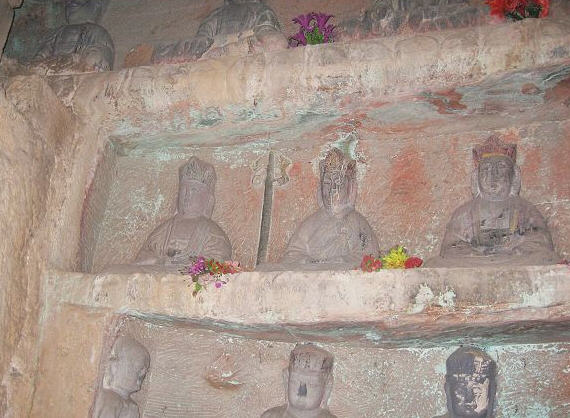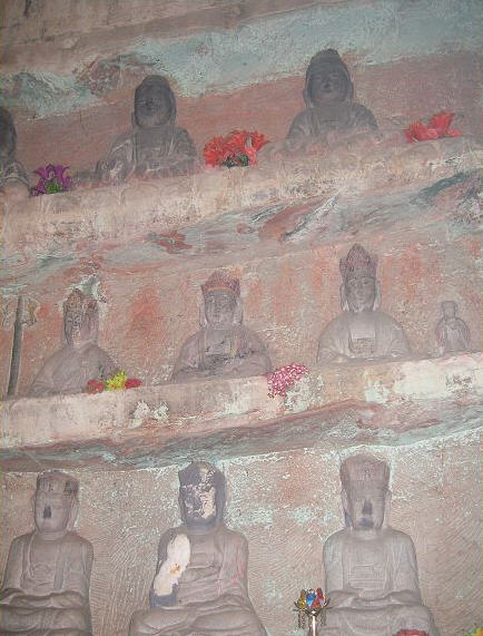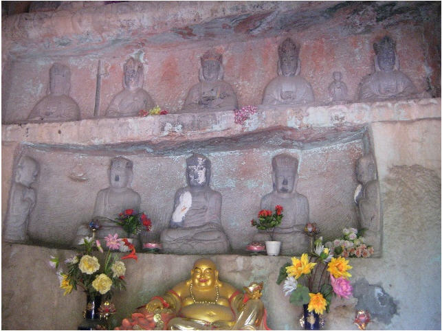 仔细观摩这组佛像,细心的游客还会发现,最底层几尊佛像有修补痕迹,最明显的是底层中间的坐佛,其头部和右臂都是用石膏还原后又涂了一层水泥?但凡遇到这种情形,很多人便会凭直觉断言,这是“文革”时被红卫兵破坏的。其实不然,济南市博物馆文物专家王建浩先生在1965年曾拍摄过一组云台寺的照片,那时“文革”尚未开始,而照片上,下层中间坐佛的头部和右臂已经被破坏。
