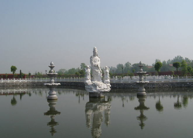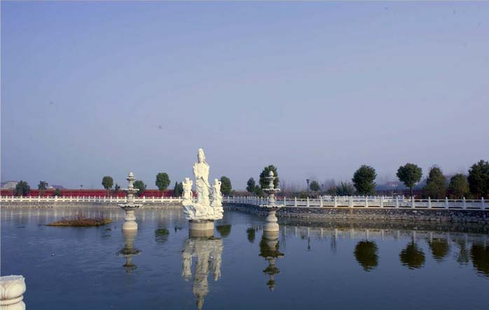 在桃花源前,建有一个硕大莲花放生池,占地面积约3000平方米。整个莲花放生池呈莲心状,外围用汉白玉精雕的围栏,足有450米长。莲花池中前端立有汉白玉观音像一尊,高5.7米,两侧立有汉白玉善财童子与龙女陪侍。池内养有信徒放生的红鱼、乌龟和甲鱼等。