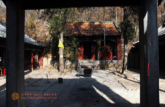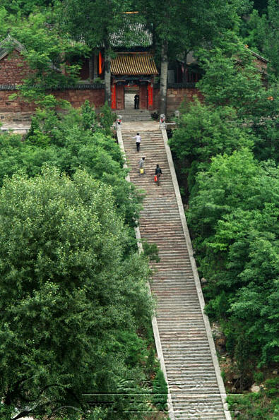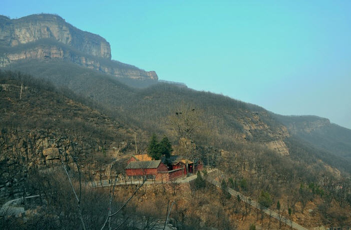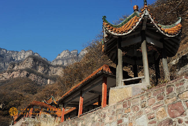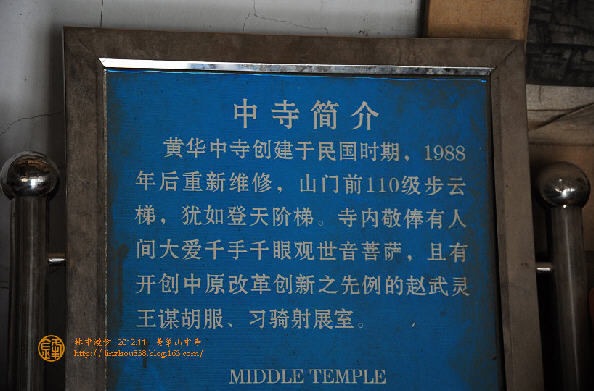 黄华中寺位距上寺下边,背倚争秀峰,创建于民国九年(公元1910年)。山门前石台阶共重108级,犹如登天阶梯。翠柏笼罩,白杨参天,环境幽雅,诗云:“万仞峰尖插紫霄,来游步步觉山高。飞仙云外舒长啸,远指天香袭锦袍。”该寺院有大佛殿和东西配殿,大佛殿为硬山顶,殿前石柱有联,上联为:“滂水浅泗青霭白云笼碧玉,”下联为:“临风顾盼丹崖翠壁舞黄华”,妙语生辉,歌颂了黄华倚山滂水、蓝天白云、丹壁翠岭的神秘灵秀之气。内塑千手千眼观音佛。左为普贤菩萨乘象,右为文殊菩萨乘狮。