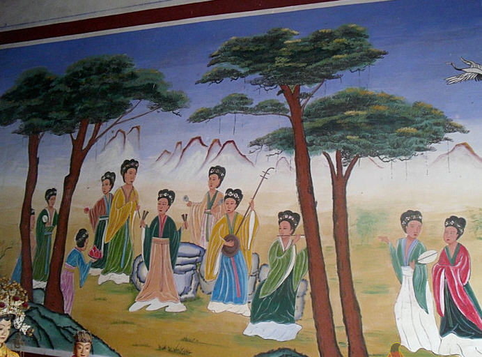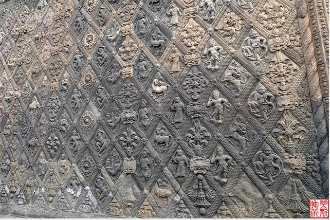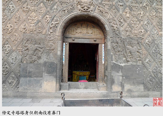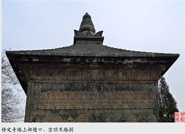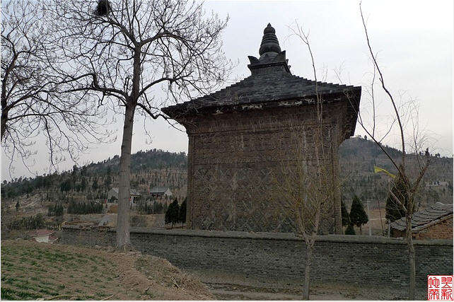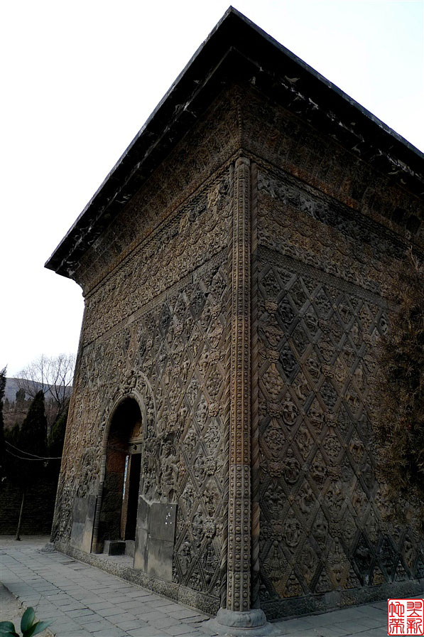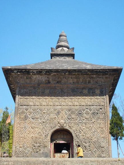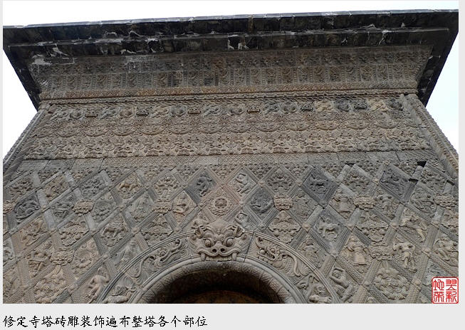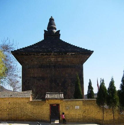 唐塔就在天王殿与铁瓦殿之间,是一座四方型是单檐亭阁砖塔,高约16米,外观朴素。塔身外壁刻满了各种雕饰,奇就奇在这些雕饰全部是用各种矩形、菱形、五边形、三角形等雕砖拼砌而成,内容既有佛教中的天王、力士、飞天等,又有道教中的真人、童子、侍女等,还有青龙白虎等民间传统图案。这种佛、道的大融合体现了唐代文化中外交融、兼收并畜的特点,是我国古代塔中的珍品。