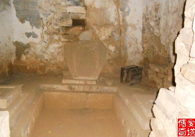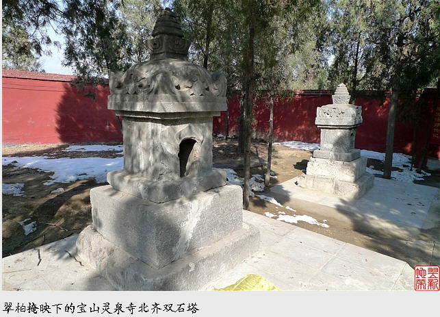灵泉寺处处是宝,每一块砖石后面都似乎铭刻着一段的历史。遗址西北现存一对单层方形石塔,塔高2.5米,塔顶呈覆钵状,塔身呈束腰状,整个塔的造型朴素大方,四面雕卷叶状纹饰,符合佛教一身清净的原则。西塔就是道凭法师的灰身塔,上刻“宝山寺大论师道凭法师烧身塔”塔铭和“大齐河清二年(公元563年)三月十七”的题记。这是这简单的铭刻,使塔葬这一习俗得以物证。