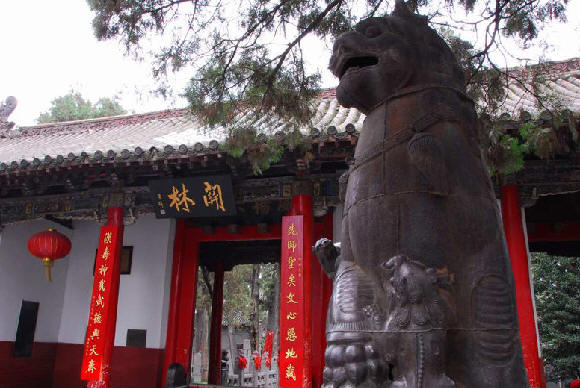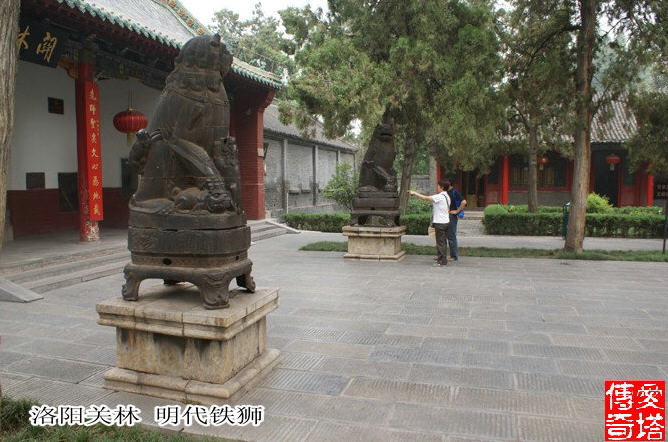 1780余年来,关林因厚葬关羽首级而名闻天下。这里峻宇连甍,古柏森然,淄素入庙,视为严宫,形成了浓厚的关公文化氛围。明朝万历二十年(1592年),在汉代关庙的原址上,扩建成占地200余亩、院落四进、殿宇廊庑150余间、规模宏远的朝拜关公圣域。兀立于广场上的“千秋鉴”楼,为旧时“灯影锣鼓话兴亡”的所在;分立于大门两侧的明代石狮,赳赳而踞,具有凛然不可侵犯的威严。极富封建意味的大门镶嵌着81颗金色门钉,体现了关林的崇高地位和关羽的身后荣耀;立于仪门左右重达3000余斤的铁狮,是明代善男信女敬奉关公的遗物,虽历400余载风风雨雨,依然肃穆含威;仪门“威扬六合”匾额为慈禧太后御笔,端庄厚重,弥足珍贵;连接仪门和拜殿的石狮御道为海内外关庙所独有,甬柱顶雕石狮104尊,百狮百态,圆润生动,毫无石刻的生硬之感,代表了乾隆时期中原石刻艺术的最高成就。
