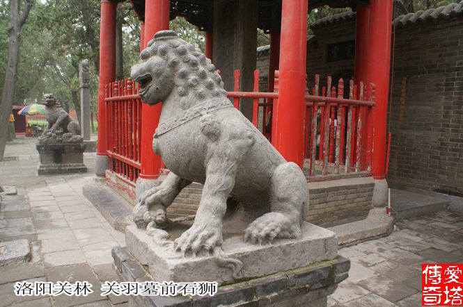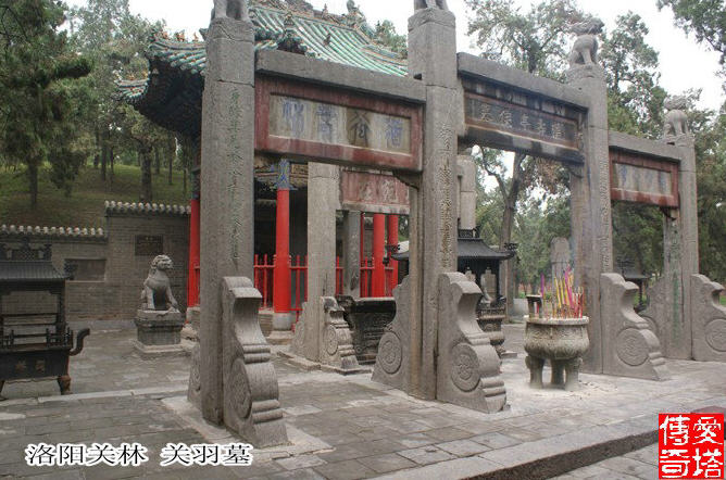 关羽墓前植有古柏千株,故称关林。关羽一生,以忠义和勇猛见称。从三国到隋,人们把他视为盖世英雄。而到隋朝以后则把关公作为神灵顶礼膜拜。 关林庙正门为五开间三门道,朱漆大门镶有81个金黄乳钉,享有中国帝王的尊贵品级。殿宇盖显高耸、飞翅凌空、气势峥嵘。厅中塑有关羽头戴12冕旒王冠、身着龙袍的坐像。关羽身旁有捧大印的儿子关平和持刀的周仓立像。后边的二殿即武殿。在其两翼有“张飞殿”“五虎殿”被称为陪殿。三殿即春秋殿,厅内有关公秉蜡看“春秋”的坐像及卧像。四周有关公战吕布、镇荆州、战长沙的彩饰画。关林后院还建有一清代石龙碑亭。它是神化关羽的又一见证。在亭碑上额刻篆收“勒封碑记”。碑面书写:“忠义神武灵佑仁勇威显关圣大帝林”。
