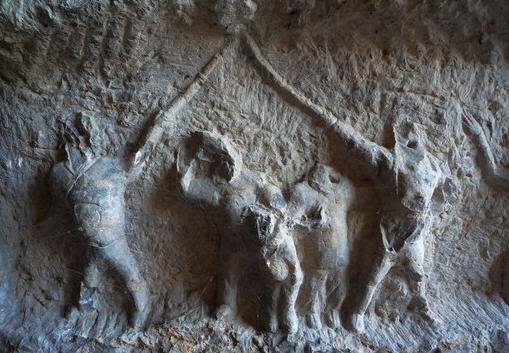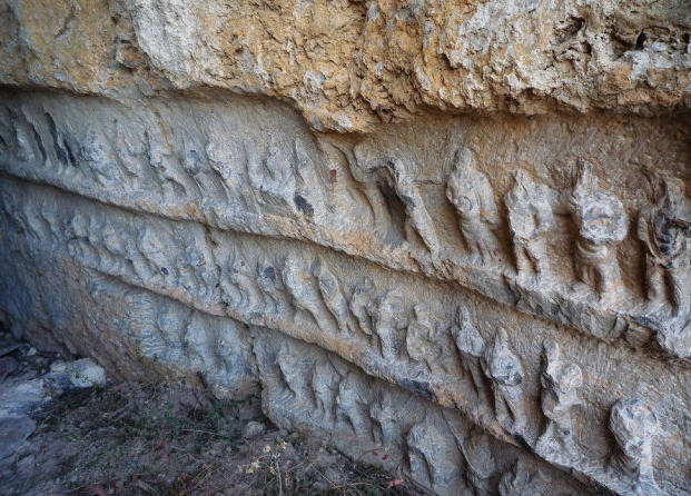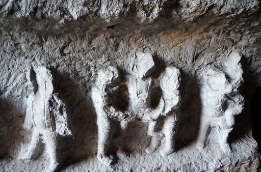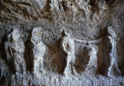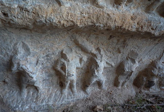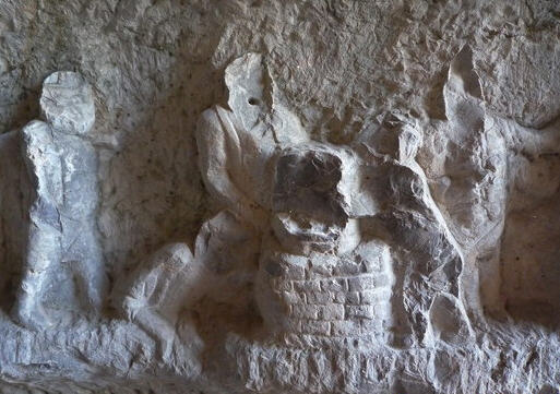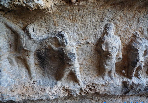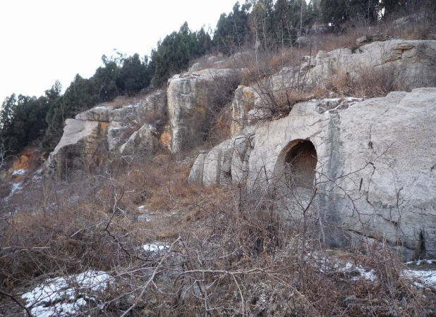 虎头山石窟造像 位于麒麟村南虎头山北侧山腰处的一自然山洞(当地称其为老虎洞)内外。山洞内两侧有造像计4铺50余尊,左侧先为三龛二铺(其中一龛未有神像)神像,形式为一神一侍,神像坐式,身着道袍,似登道靴;侍者立姿,腹部凸鼓。后为阶梯式上下并列三排造像一铺,造像均立姿,残损较重难以辨认。右侧先为一龛,造像上部残失,不可辨。后为上下三层并列造像一铺,造型较小,有担抬、投掷等多样举状。洞口外右侧又见石龛三组,大小不同,皆残。洞口外山崖处有题记四则,多漫漶不清,其中有“隆庆、圣母殿”字样,具体雕刻年代不详。整个造像多已残失,头部无存。虎头山顶遗有明代全石结构钟楼一件,造型大方,刻有题记。钟楼旁遗有顺治五年修“圣母殿”题名碑一通(已残断)。钟楼周边多见灰板瓦、绿琉璃瓦、龙纹砖雕等建筑残件。