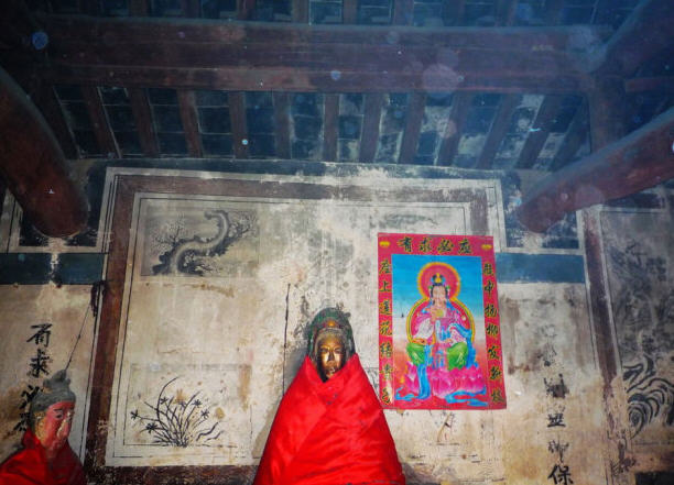 进入正殿看到,原本通畅的三开间大殿,已被后人打上隔墙,分成了正、侧两间,更让我们惊诧的是:用做侧门过梁的条石竟然是记载上水庵修记的碑石,碑文记载“大明成化一十四年重修上水庵……由上水阉道姑妙秀精勤修造殿宇……”等字样。