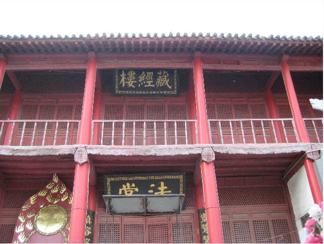 大雄宝殿北面是观音殿。据介绍,此殿在坍塌后于2002年重建。穿过观音殿,便是目前原始风貌保存最完整的灵鹫阁。灵鹫阁是一栋五开间二层木制阁楼,据说这里原来是藏佛经的地方,因此又被称为藏经阁。从一楼大殿有一条不足半米的窄窄木梯直通二楼。我们顺木梯而上,二楼虽然尘土遍布,杂物横陈,但是顶梁、墙壁、廊柱等建筑细节部分依然雕刻着精美的图案,古香古色的花棂门窗吱呀呀发出阵阵响声,让人以为回到了唐朝此寺的兴盛时期。
