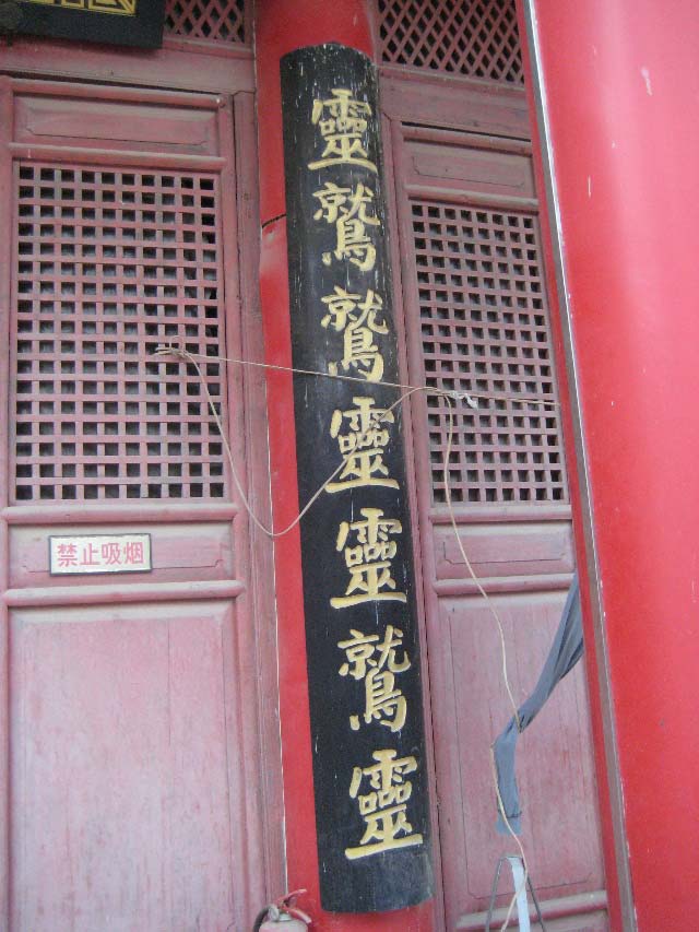 五座大殿皆是青瓦灰墙、高大巍峨。门殿里立着哼哈二将,看守着这座千年庙宇。向北穿过一个小小的院落,便是憨师殿,殿里供着弥勒佛。此殿顶部的青瓦整洁清秀,乃是仿古重修,笔直浑厚的殿墙依然灰蒙蒙的,保留着沧桑的岁月痕迹。殿前竖着一块残碑,仔细辨认,上面记载着康熙年间重修灵鹫寺的旧事。穿过憨师殿便是大雄宝殿,此殿供奉着释迦牟尼,香火缭绕,气氛庄严。大雄宝殿为面阔三间、前出厦结构,檐下木柱底部由莲花柱础支撑,红漆廊柱已经斑驳,前檐也有一部分换成红色的新瓦。