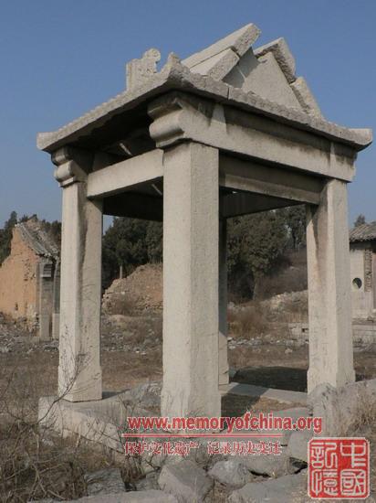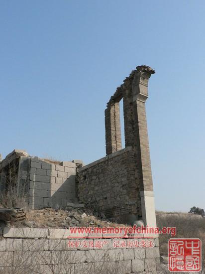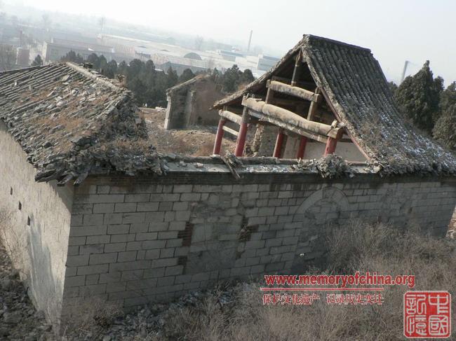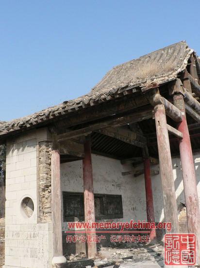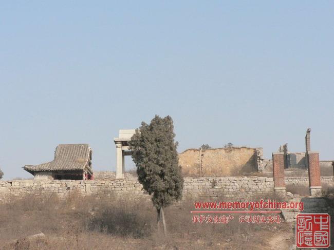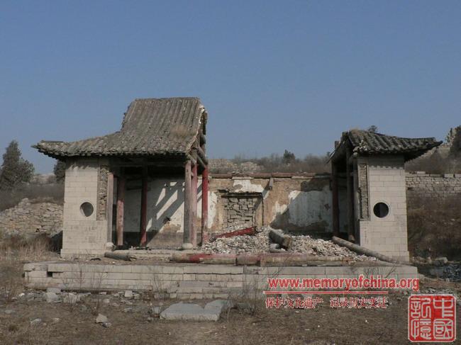 沿山脚南侧道路走近峨嵋山,在这座被几家小工厂所环抱的小山南坡,一处阶梯状错落分布的组合式古建筑遗址映入记者眼帘。只见该建筑因地势而分为上、下两院,位于半山腰的下院由正殿、东西配殿、钟亭等组成,山门已失,仅剩下被封堵的残迹,但正殿与东配殿之间的拱券形偏门尚存。主体保存完好的正殿檐角高挑,面阔5间,进深3间,虽然顶部青瓦已部分破损,但支撑大殿的12根红色立柱尚且坚挺,每根直径均有40多厘米。西配殿已悉数坍塌,仅存部分墙体,东配殿部分坍塌,呈摇摇欲倾状。歇山顶式钟亭位于下院东南角,柱、梁、檐、棚均为石材,粗壮但不显笨拙。依据东钟西鼓的传统,院西南角还应对称设有鼓亭,可惜已踪迹难寻。