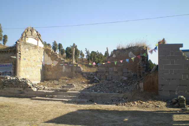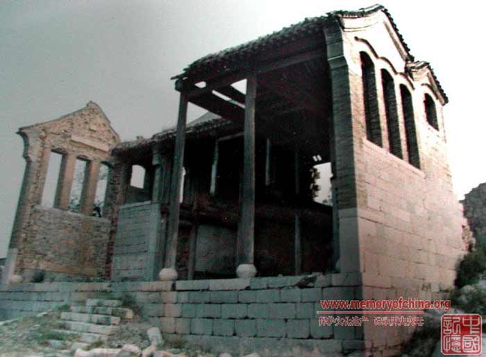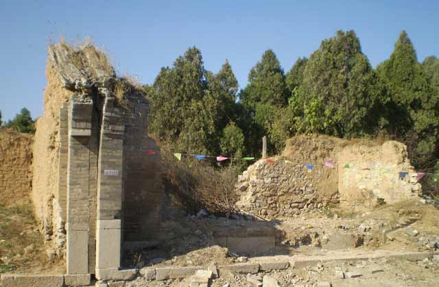 由下院东侧的道路拾阶而上,便可到达位于山顶的上院。上院由东、西两座建筑组成,二者在一条东西线上,中间隔有十余米的距离。或许是山顶风大的原因,东、西建筑全部坍塌,西殿仅存西山墙,东殿仅存东山墙,但从残迹可看出,当初西殿为一层殿堂,东殿则为二层楼阁。
