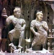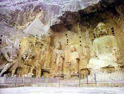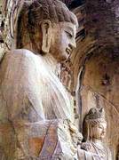 奉先寺位于龙门西山南部,是龙门石窟中规模最大、最具有代表性的露天佛龛。主佛卢舍那高17.14米,是龙门石窟中最大的佛像。这尊佛像身披袈裟,面容丰满,嘴角微翘,略含笑意,眼帘低垂,宁静的目光蕴涵着无穷智慧,流露出对尘世的关怀。端庄大度、淳厚安祥的仪态令人不得不肃然起敬。两旁侍立的弟子迦叶严谨老成,阿难虔诚顺服,菩萨端丽矜持,天王蹙眉怒目,力士威武雄健。形态各异、刻画传神的造像显示了盛唐雕塑艺术的高度成就,成为石雕艺术史上的奇观。相传武则天为造这座佛龛曾“助脂粉钱二万贯”,并亲率群臣参加卢舍那佛的“开光”仪式。