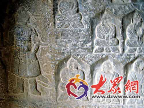 而石堂内东、西、北三面石壁上,刻满了大大小小的佛像和菩萨。据统计,共有大小浮雕石像89尊。最大的一组石像高60厘米,宽30厘米。中间较大的一尊是佛祖,佛祖的两侧各有一尊较小的菩萨,也就是典型的“一佛二菩萨”三尊像石雕。这是唐代比较流行的造型。而最小的石像仅高12厘米,宽6厘米,为独尊石像。王晶讲,这些石像经过千年的洗礼,纹路仍然比较清晰,给人浑厚有力的感觉。但遗憾的是,经过文革时期的破坏,石像面部的五官几乎全遭损坏,仅剩5尊比较好,石像身子比较完整的也很少。