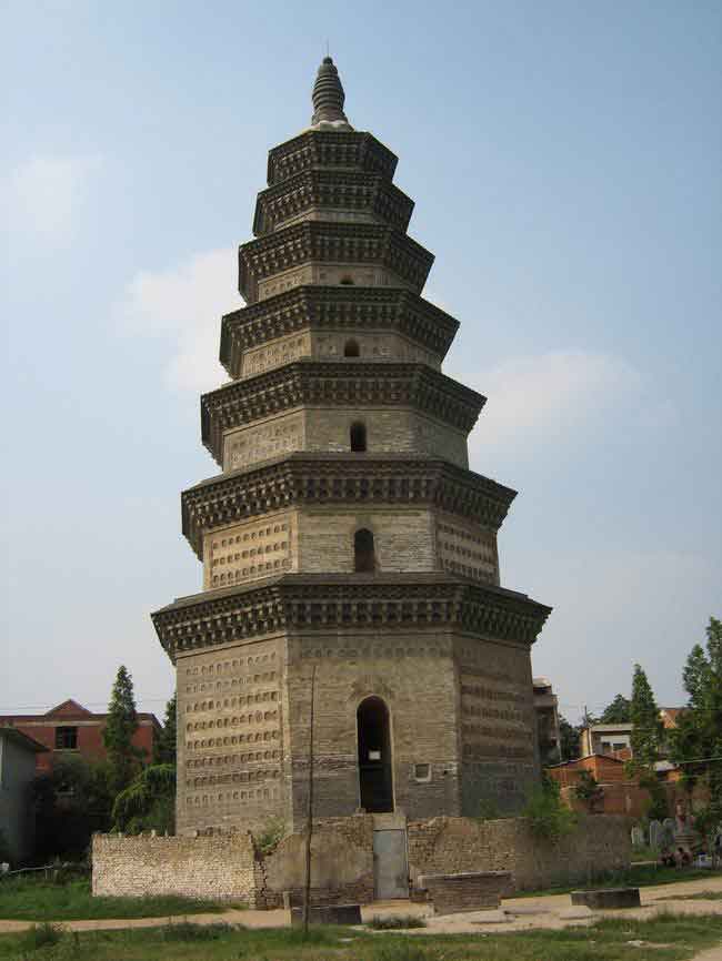 省级文物保护单位,北宋天圣十年(1032年)建,座落于邓县城内。7级楼阁式砖塔,高36米,平面呈八角形,共面阔自下而上逐层收敛,每层高度均匀递减,使塔之外廓呈抛物线形。塔体外表嵌砌佛像雕砖,南北两面辟有半圆形券门,塔内有塔心室和梯道,“凭塔而望,四远廓然”。塔下有地宫,传为海眼,“因为塔以镇之”。(载自南阳地区志第三十九卷223页)