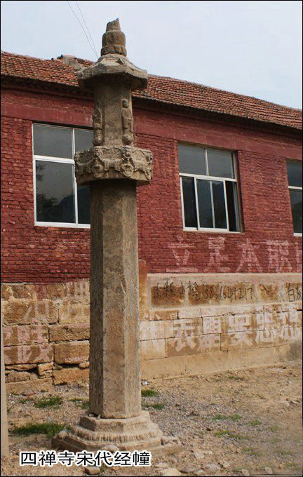 在长清四禅寺遗址,现存经幢一座,上面至少出现五处年号,其中熙宁己酉(1069年)为立幢时间,刻文中说宋大中祥符七年(1014年)敕修永庆寺(即四禅寺),另外三处年号为宋熙宁庚戌(1070年)、宋熙宁壬子(1072年)、熙宁丙辰(1076年),都是游记性质的刻字。据此,可以肯定地说,此幢为宋代经幢。