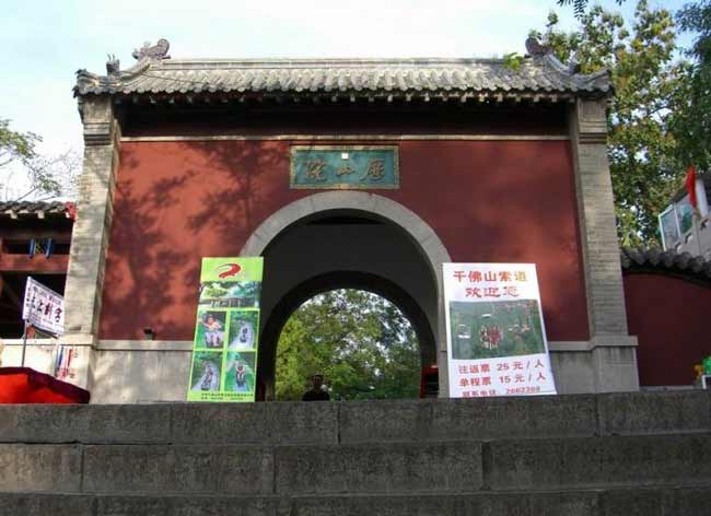 院西进门两侧钟鼓二楼矗立。北侧架长廊,壁嵌国家副主席董必武、诗人郭沫若、书法家赵朴初游千佛山诗刻题记。其中1959年春郭沫若《登历山》诗曰:“俯瞰齐州烟九点,踏寻崖窟佛多尊。半轮新月天心吐,一片东风扫雪痕。”与长廊相对,南侧千佛崖危立,崖上镌刻隋代佛像多尊。山崖由西向东,依次有龙泉洞、极乐洞、黔娄洞、洞天福地坊、对华亭等古迹。整个寺院,殿宇亭廊错落有致,苍松翠柏,储绿泄润,钟声盈耳,香烟缭绕,颇有深山古刹妙趣。