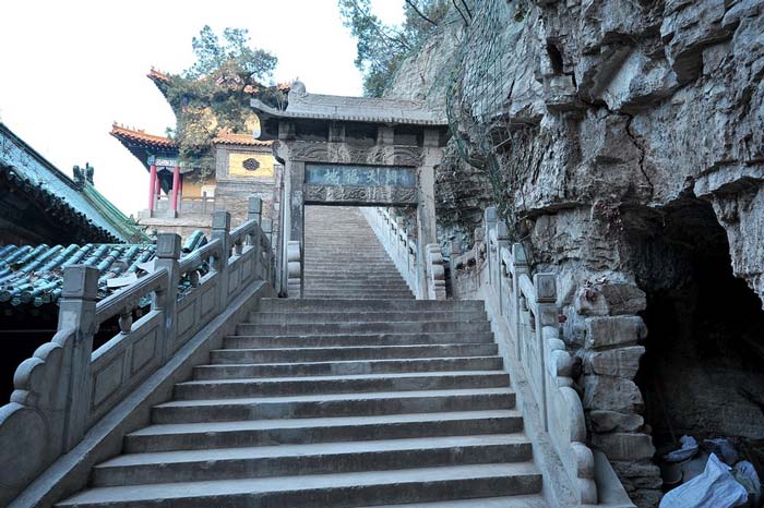 “洞天福地”石坊在黔娄洞的东侧,横跨于对华亭西门石级上。坊上匾额书写“洞天福地”四字。该坊建于清乾隆五十七年(1792年),字为护理山东巡抚江兰所书。石坊虽不算大,但雕刻却很有特点,具有较高的艺术价值。石坊通体用青石仿木结构雕砌而成,形成二柱一楼式,飞檐起脊。石脊两侧,饰有花纹,刀法纯熟,线条流畅,颇有韵致。两端雕有正吻。檐的四角下,原有风铃各一枚,清风稍吹,铃声远扬。檐上雕有瓦垅,檐下云头斗拱承托,拱下额枋分别刻有流云饰纹和二龙戏珠、狮子滚绣球等浮雕。两柱下石鼓浑厚。整体结构匀称协调,构思奇巧,古朴典雅。坊的南侧,为悬崖峭壁,葱郁的树丛中,隐有石佛一窟。坊北侧有古椿树垂荫,将石坊衬托得更富情趣。