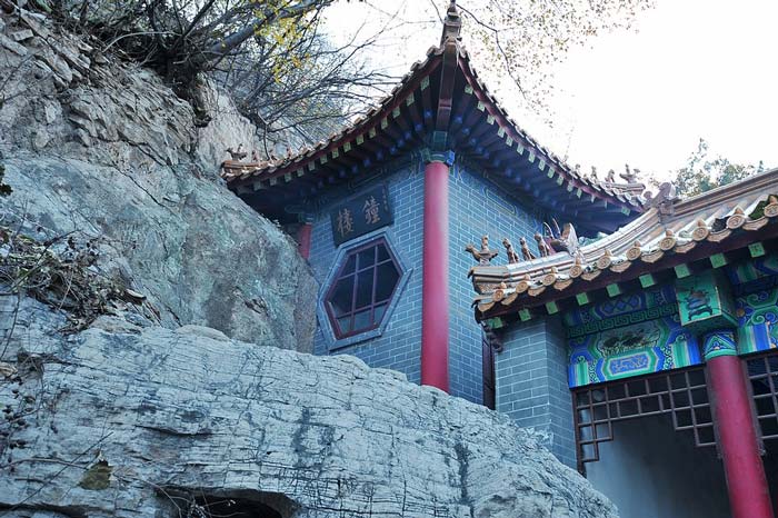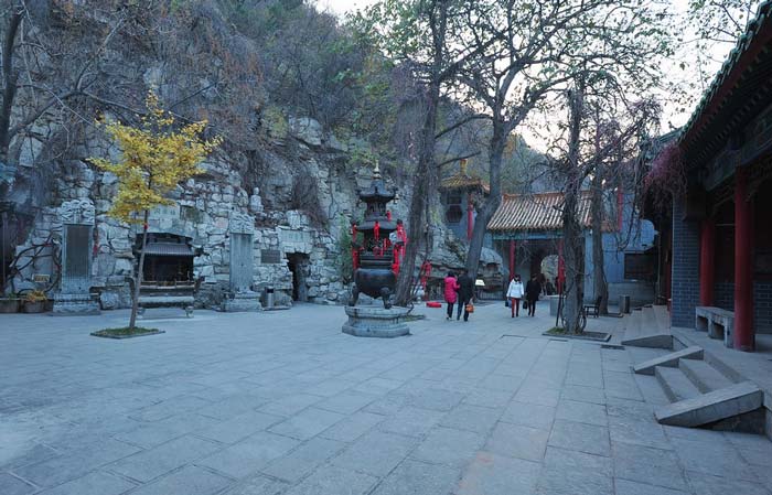 院内南侧悬崖下卧一石洞,洞上嵌“吕祖洞”石刻匾额。洞内原有吕洞宾石像。洞外石壁间,有记载吕祖的道教传说、重修千佛山庙记等清朝石刻四方。洞穴上端,柏树榆树长势奇特,其根暴露在外面如龙爪,匍匐于地上似蛇形,其干挺拔多姿。这里景色尤以秋日最美丽,山菊开着黄花,藤蔓丹叶如霞。因境界清幽,被明朝人称作“石洞绝尘”,为古时历下十六景之一。整个院落,被绿荫覆盖,显得郁森清凉,历为避暑胜地。因院落幽静,再加素日常闭,很少有人来此游览,故亭曾悬匾额“飞尘不到”。